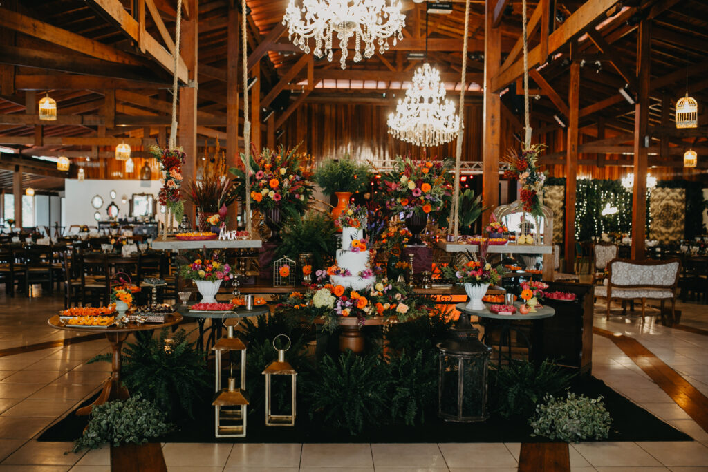 Esse foi o resultado! Também amo o conceito do bolo numa mesa central e os balanços para os doces.