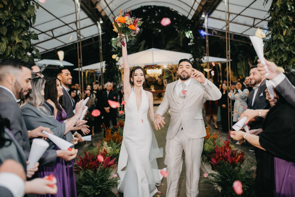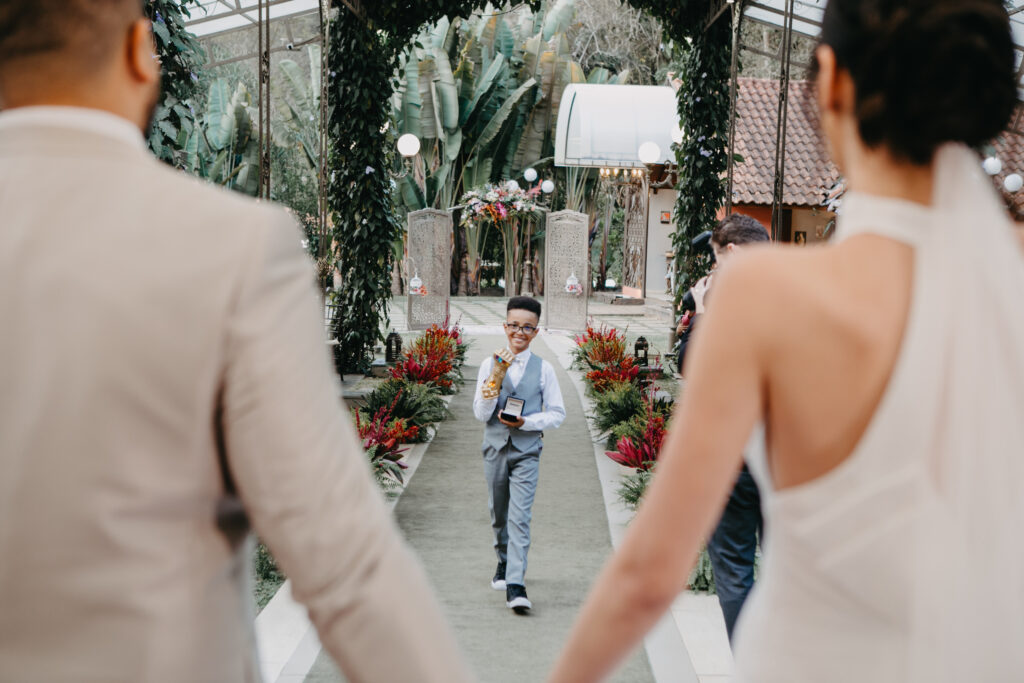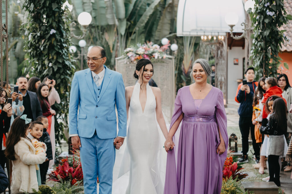 Outro momento que eu resolvi adaptar porque também fazia mais sentido para nós: eu entrei com os meus pais de mãos dadas. Eu não ficava feliz com a ideia de deixar minha mãe entrar antes e ficar lá na frente esperando, sei que esse momento importava absurdamente para ela, fora que ela não é mãe de menino, ou seja, além de tudo que isso significa pra nós, ela também teria a oportunidade de levar a filha até o altar. E de mãos dadas!