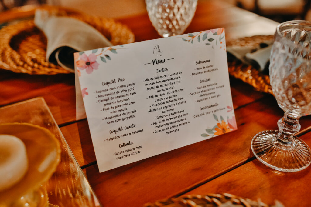 Para o menu, buscamos mesclar opções “sem erro”, mas também adicionamos coisas que eram nossa cara, pois era importante fazer nossos convidados lembrarem de nós nos detalhes. Quem nos conhece profudamente, sabe quais itens desse menu foram escolhidos a dedo por nos representarem bem.
