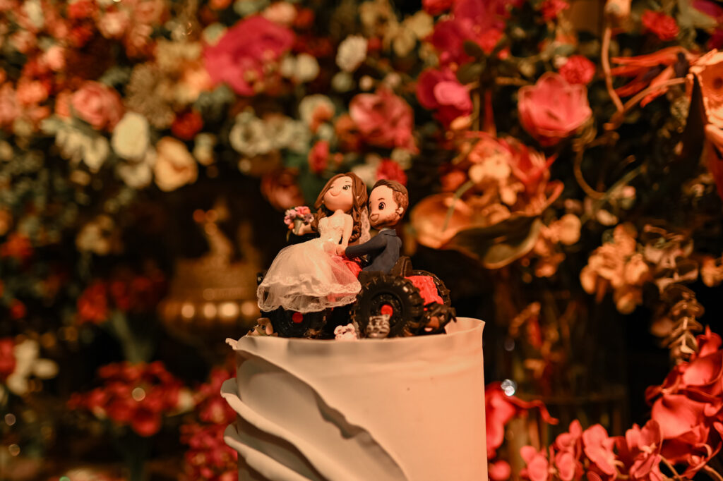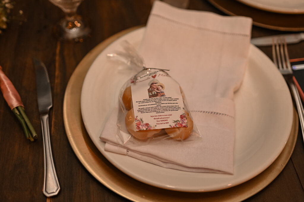 E o mais especial: o topo de bolo e o porta-aliança foram criados por outra noiva do grupo, o que tornou tudo ainda mais afetivo.