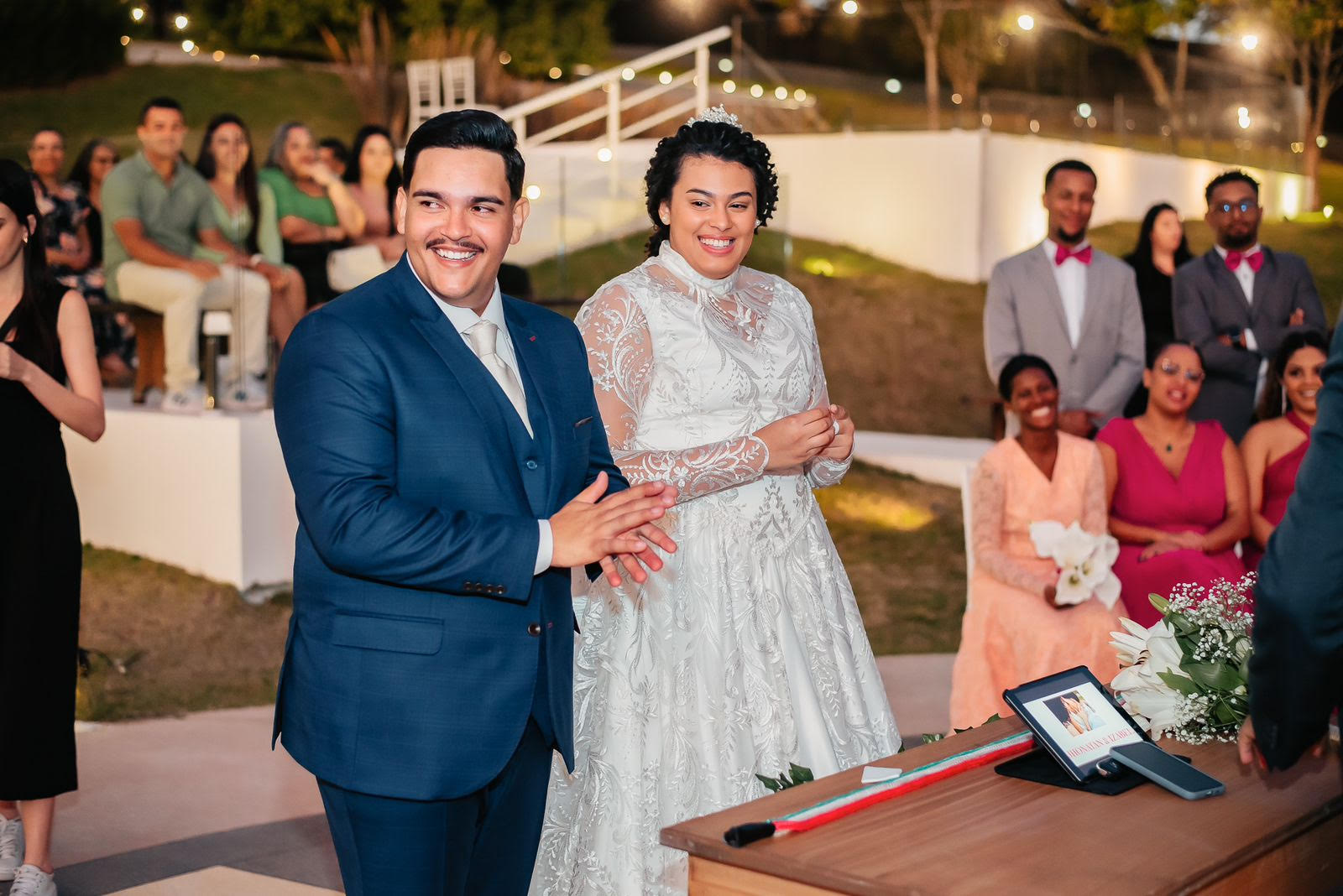 A cerimônia foi leve, do jeitinho deles. Teve riso, lágrima e até umas “bronquinhas” trocadas com o olhar durante a mensagem. Tudo muito íntimo, muito real. Era amor em forma de detalhes.